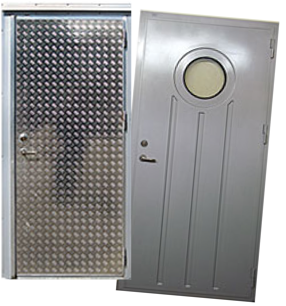 Våra dörrar tillverkas i en rad standardstorlekar som enkel- eller som pardörrar, men kan även kundanpassas i olika storlekar och utföranden. Standarddörren levereras i omålad aluminium, men kan lackeras i regnbågens alla färger. För att ytterligare släppa in mer ljus och liv kan dörrarna utrustas med en glasruta, rund eller kantig, och i mått efter era behov.